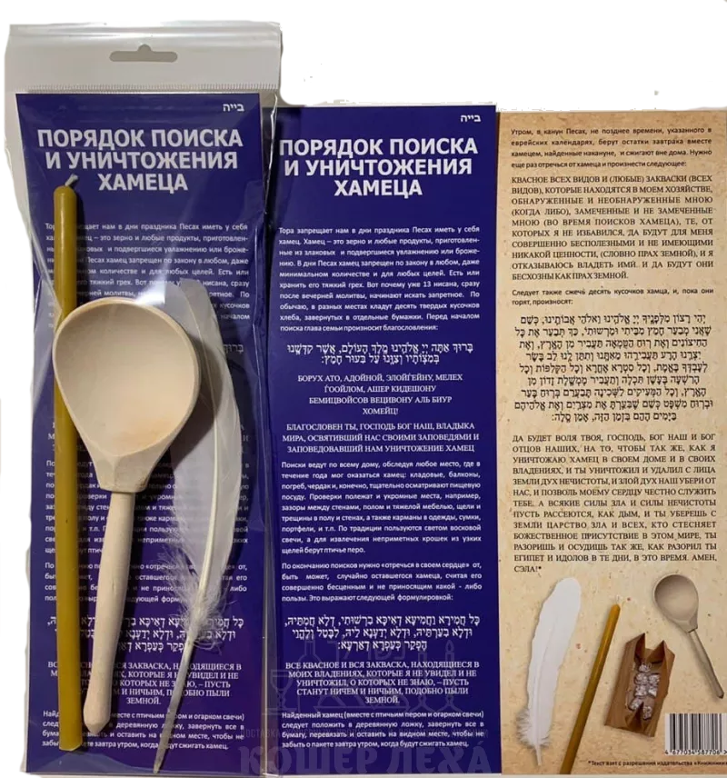 Поиск проводится после наступления темноты вечером накануне Песаха (в ночь на 14-е число еврейского месяца Нисан). В данном наборе вы найдете все необходмое для соблюдение заповеди.