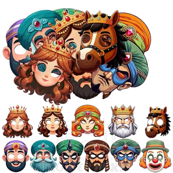 В комплект входят 11 масок Пурима, 11 деревянных палочек и 1 наклейка.